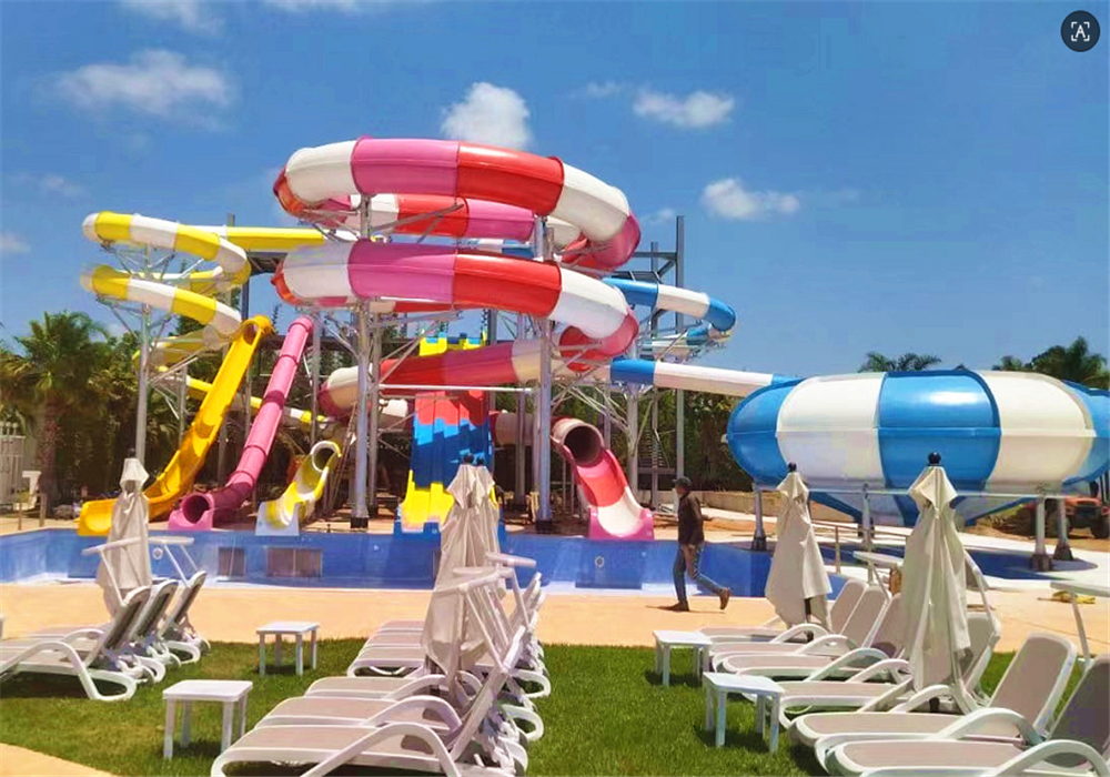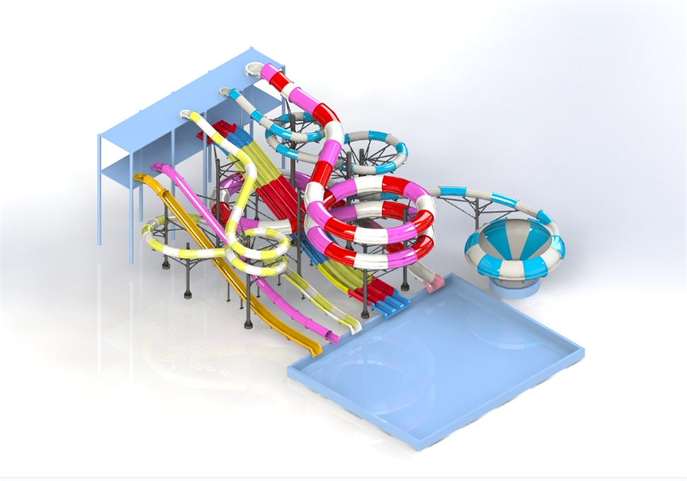 This project is designed for the hotel's supporting facilities. The water-based amusement facilities include double-person raft slides, spiral slides, multi-person competitive slides, vertical slides, bowl-shaped slides, and enclosed slides. These various slides are combined to form a comprehensive slide system.